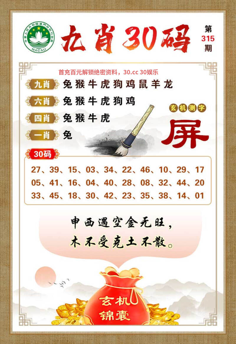 | 315期:九肖【蛇狗鸡龙羊兔猪虎鼠】开:虎04中 |